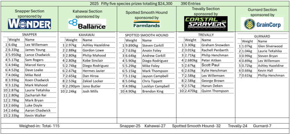 Number of different competitors who weighed-in fish: Snapper-25 Kahawai-42 Spotted Smooth Hound-24 Trevally-10 Gurnard-15 | ||||